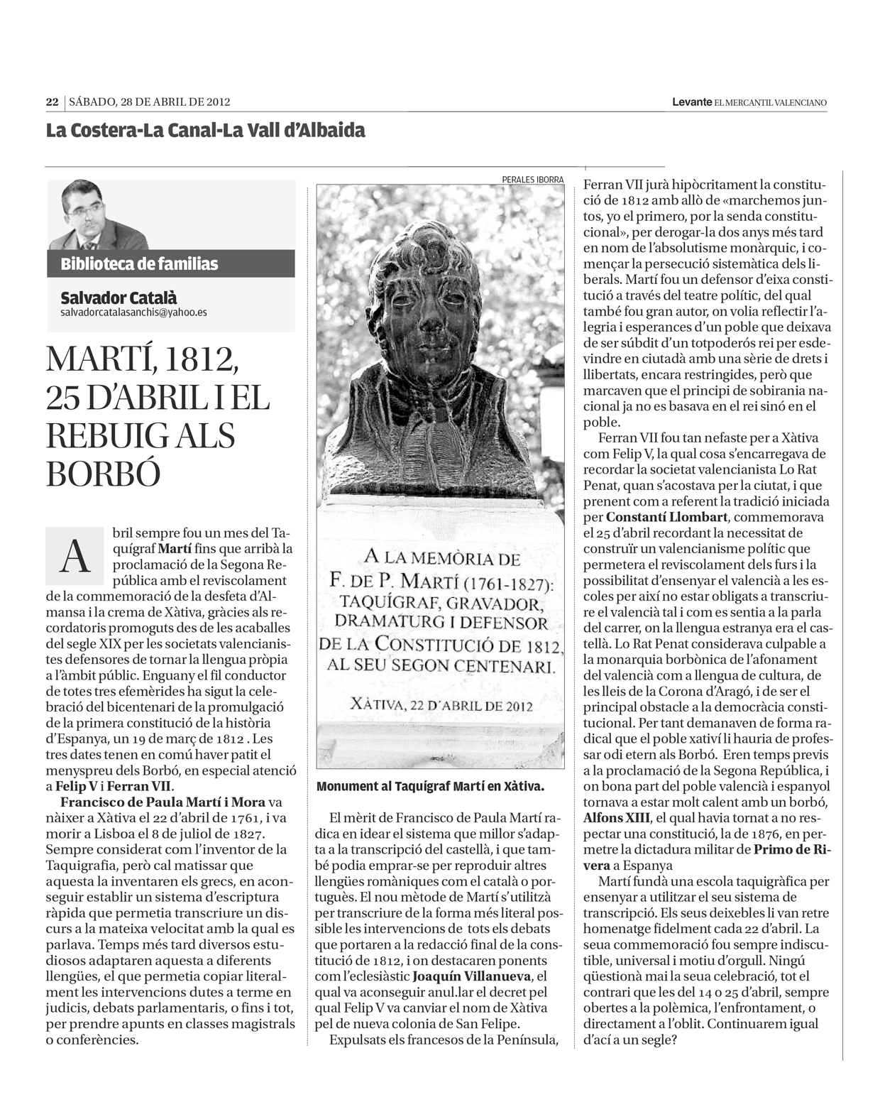 Abr282012HISTORIA DE ESPAÑA A TRAVÉS DE XÀTIVACategoría: HISTORIA DE ESPAÑA A TRAVÉS DE XÀTIVA Autor: Salvador Catala Sanchis http://www.bibliotecadefamilias.com Navegación entre publicacionesAnteriorPublicación anterior:Fernando Valera y la Xàtiva republicanaSiguientePublicación siguiente:L’efímera vida artística de «Caldereta»Related posts LA COMMEMORACIÓ DEL 12 D’OCTUBRE A LA XÀTIVA DE 192411 octubre, 2024LA HUELLA DE RIBERA EN XÀTIVA11 octubre, 2024DESPERTANT L’AMOR PER XÀTIVA EN LA FIRA DE 192421 agosto, 2024XÀTIVA EN TIEMPOS DE PRIMO DE RIVERA15 julio, 2024150 AÑOS DE CRUZ ROJA EN XÀTIVA9 diciembre, 2023PROCLAMACIÓN DE LA MARE DE DEU DE LA SEU5 agosto, 2023EL INICIO DE LA RUTA DEL AGUARDIENTE EN XÀTIVA22 julio, 2023LA MORT DE LA PROVINCIA DE XÀTIVA8 julio, 2023XÀTIVA Y LOS CAÍDOS EN LA SEGUNDA GUERRA MUNDIAL13 mayo, 2023A VOTAR, SETABENSES2 mayo, 2023EL DESTACADO PAPEL DE LOS VILLANUEVA EN LA HITORIA DE XÀTIVA Y DE ESPAÑA8 abril, 2023BELLESES FALLERES DE LA REPÚBLICA18 marzo, 2023XÀTIVA, LA CAPITAL OLVIDADA DE LA GERMANÍA11 marzo, 2023VALENCIANS VÍCTIMES DE LA SEGONA GUERRA MUNDIAL4 febrero, 2023EL BICENTENARIO DE LA DIPUTACIÓN DE XÀTIVA28 mayo, 2022DIEGO MARVALL NOTARI EN TEMPS DE FELIP V30 abril, 2022XÀTIVA EN TIEMPOS DE CÓLERA15 marzo, 2022LA VIOLÈNCIA POLÍTICA TORNA A EUROPA5 marzo, 2022EL HUÉRFANO SETABENSE QUE IMPULSÓ LA PSICOLOGÍA MODERNA1 marzo, 2022EL PAREDÓN DE LA CASA BLANCA DE XÀTIVA26 febrero, 2022XÀTIVA I LA PERPÉTUA TRANSICIÓ VALENCIANA5 febrero, 20221921 EL INICIO DE LA NUEVA XÀTIVA8 enero, 2022DEL CÒLERA AL CORONAVIRUS1 junio, 2020BOSH I MORATA1 junio, 2020La calúmnia sobre Gil Ferraut9 febrero, 2019La exhumación de María Climent Mateu20 octubre, 2018Una victòria moral perpètua6 octubre, 2018Xàtiva contra los Bonaparte14 julio, 2018Xàtiva i el socarrat. Mes de juny de 170730 junio, 2018Les víctimes del bombardeig de l’estació de Xàtiva10 febrero, 2018La lliga de dones de Xàtiva13 enero, 2018Setabenses asesinados por los nazis26 agosto, 2017Amor tricolor en un 12 de abril12 abril, 2014Manolo Casesnoves i l’espirit de la transició18 enero, 2014Gonzalo Viñes y la Cova Negra9 noviembre, 2013Quan la fira era motor econòmic17 agosto, 2013Vicente Parra Servet: un exilio con final feliz20 julio, 2013El origen del ferrocarril Xàtiva-Alcoi6 julio, 2013El nacimiento del semanario «Izquierda»22 junio, 2013El monument a les llibertats27 abril, 2013En recuerdo de los políticos setabenses de 193113 abril, 2013Xàtiva i el XIX Centenario de la muerte de Cristo30 marzo, 2013En recuerdo de los políticos del Frente Popular16 febrero, 2013En recuerdo del agrario y la D.R.A.V.19 enero, 2013De cuando Xàtiva honró a Perón10 noviembre, 2012De cuando Xàtiva adoptó a Franco27 octubre, 2012El inspector Morcillo y la desaparición del matadero de Xàtiva13 octubre, 2012La política i els canvis del nomenclàtor urbà de Xàtiva29 septiembre, 2012Cuando el estado frenó el derroche de Xàtiva1 septiembre, 2012Manuel Casesnoves y el nacional catolicismo4 agosto, 2012Artemina Botella y el alzamiento nacional21 julio, 2012L’escàndol de la platja d’Alboi7 julio, 2012Un Corpus de encierro y las «soldados de Herodes»9 junio, 2012Fernando Valera y la Xàtiva republicana14 abril, 2012La inútil victoria del Frente Popular18 febrero, 2012