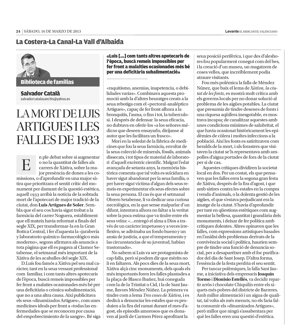 Mar162013HISTORIA DE FAMILIASCategoría: HISTORIA DE FAMILIAS Autor: Salvador Catala Sanchis http://www.bibliotecadefamilias.com Navegación entre publicacionesAnteriorPublicación anterior:En recuerdo de los políticos del Frente PopularSiguientePublicación siguiente:Xàtiva i el XIX Centenario de la muerte de CristoRelated postsFANNY MARTZ Y EL VERDADERO FEMINISMO. 11 noviembre, 2024JOSÉ SAMIT, EL PINTOR DE LA PREHISTORIA16 septiembre, 2024LA SAGA DE LOS SIMARRO27 julio, 2024LA SALVACIÓ DEL PORTAL DEL LLEÓ DE XÀTIVA21 julio, 2024DE CASA SANCHIS A LAS DELICIAS DEL FORN DE PLA29 abril, 2023TRAS LA PISTA DEL CINE FUSTER DE XÀTIVA21 enero, 2023DE LÁPIDAS, DIFUNTOS E HIJOS ILUSTRES DE XÀTIVA2 noviembre, 2019La intrèpida vida del professor La Torre9 septiembre, 2019COSTANTINO BALLESTER JULBE Y LA GERMANÍA DE XÀTIVA24 agosto, 2019El pianista Asíns9 septiembre, 2017Castañeda i les vicissituds d’un manuscrit sobre la crema de Xàtiva23 abril, 2016Sin título21 noviembre, 2015LOS TORREGROSA, DE LAS TARTANAS AL GARAJE ESPAÑA26 septiembre, 2015El riu Sants i la guerra per l’aigua29 marzo, 2014José Fabra y los lobos1 febrero, 2014Los hijos de Rafael Reig y la leche el niño26 octubre, 2013Xàtiva i els Casesnoves: república i fe cristiana8 junio, 2013José Aragonés y el significado de la cultura2 febrero, 2013La agrupación femenina republicana y la fiesta del niño5 enero, 2013Recordant un bon cristià8 diciembre, 2012El joven Mompó y el resplandor artístico de Xàtiva24 noviembre, 2012El Rullet, de torero a carnicero15 septiembre, 2012L’efímera vida artística de «Caldereta»26 mayo, 2012Antonio Chocomeli y el recluta31 marzo, 2012Falles i Feminisme17 marzo, 2012El nacimiento de una feminista3 marzo, 2012