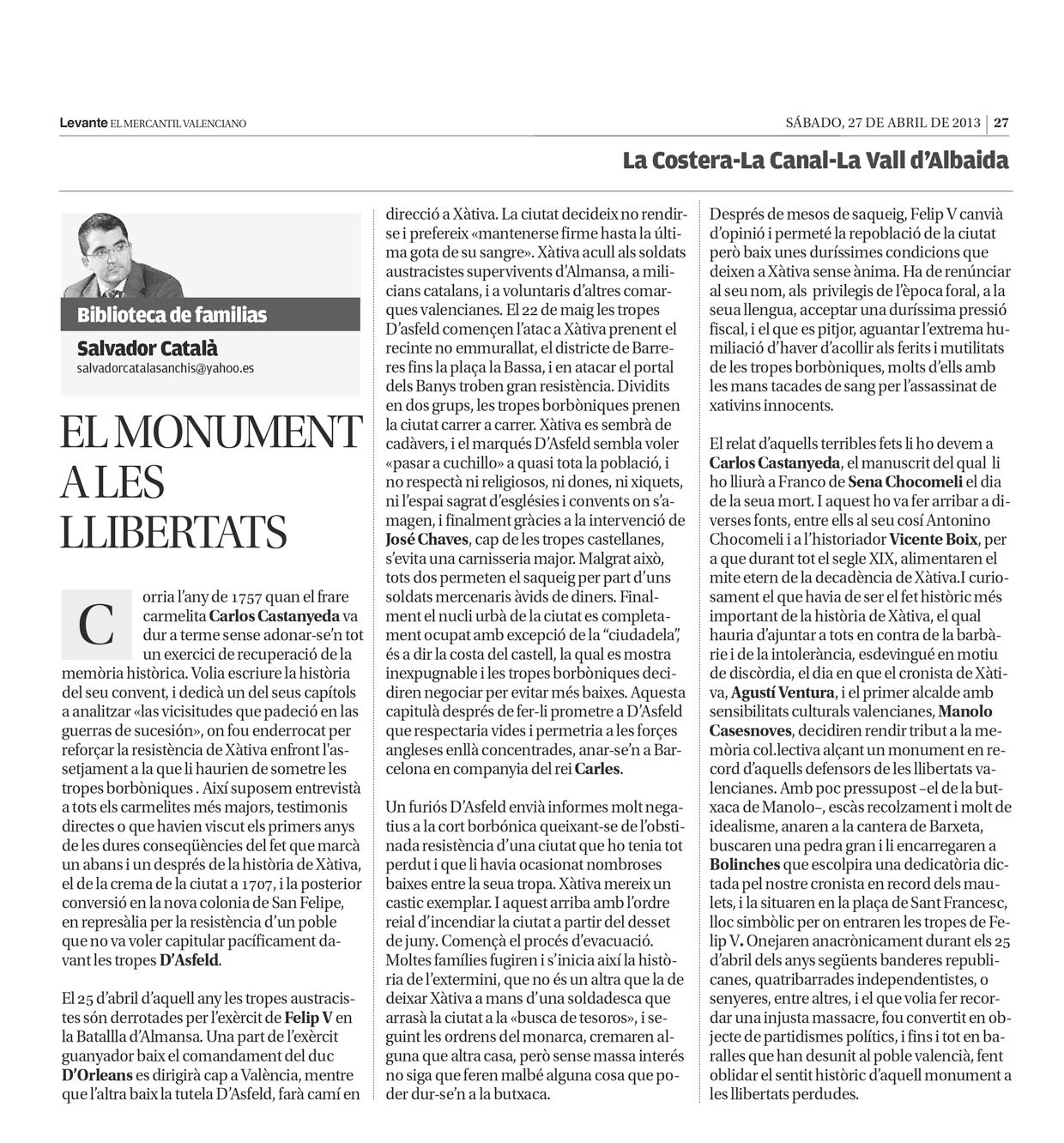 Abr272013HISTORIA DE ESPAÑA A TRAVÉS DE XÀTIVACategoría: HISTORIA DE ESPAÑA A TRAVÉS DE XÀTIVA Autor: Salvador Catala Sanchis http://www.bibliotecadefamilias.com Navegación entre publicacionesAnteriorPublicación anterior:En recuerdo de los políticos setabenses de 1931SiguientePublicación siguiente:De la confitería Tortosa a Dulces CamposRelated posts LA COMMEMORACIÓ DEL 12 D’OCTUBRE A LA XÀTIVA DE 192411 octubre, 2024LA HUELLA DE RIBERA EN XÀTIVA11 octubre, 2024DESPERTANT L’AMOR PER XÀTIVA EN LA FIRA DE 192421 agosto, 2024XÀTIVA EN TIEMPOS DE PRIMO DE RIVERA15 julio, 2024150 AÑOS DE CRUZ ROJA EN XÀTIVA9 diciembre, 2023PROCLAMACIÓN DE LA MARE DE DEU DE LA SEU5 agosto, 2023EL INICIO DE LA RUTA DEL AGUARDIENTE EN XÀTIVA22 julio, 2023LA MORT DE LA PROVINCIA DE XÀTIVA8 julio, 2023XÀTIVA Y LOS CAÍDOS EN LA SEGUNDA GUERRA MUNDIAL13 mayo, 2023A VOTAR, SETABENSES2 mayo, 2023EL DESTACADO PAPEL DE LOS VILLANUEVA EN LA HITORIA DE XÀTIVA Y DE ESPAÑA8 abril, 2023BELLESES FALLERES DE LA REPÚBLICA18 marzo, 2023XÀTIVA, LA CAPITAL OLVIDADA DE LA GERMANÍA11 marzo, 2023VALENCIANS VÍCTIMES DE LA SEGONA GUERRA MUNDIAL4 febrero, 2023EL BICENTENARIO DE LA DIPUTACIÓN DE XÀTIVA28 mayo, 2022DIEGO MARVALL NOTARI EN TEMPS DE FELIP V30 abril, 2022XÀTIVA EN TIEMPOS DE CÓLERA15 marzo, 2022LA VIOLÈNCIA POLÍTICA TORNA A EUROPA5 marzo, 2022EL HUÉRFANO SETABENSE QUE IMPULSÓ LA PSICOLOGÍA MODERNA1 marzo, 2022EL PAREDÓN DE LA CASA BLANCA DE XÀTIVA26 febrero, 2022XÀTIVA I LA PERPÉTUA TRANSICIÓ VALENCIANA5 febrero, 20221921 EL INICIO DE LA NUEVA XÀTIVA8 enero, 2022DEL CÒLERA AL CORONAVIRUS1 junio, 2020BOSH I MORATA1 junio, 2020La calúmnia sobre Gil Ferraut9 febrero, 2019La exhumación de María Climent Mateu20 octubre, 2018Una victòria moral perpètua6 octubre, 2018Xàtiva contra los Bonaparte14 julio, 2018Xàtiva i el socarrat. Mes de juny de 170730 junio, 2018Les víctimes del bombardeig de l’estació de Xàtiva10 febrero, 2018La lliga de dones de Xàtiva13 enero, 2018Setabenses asesinados por los nazis26 agosto, 2017Amor tricolor en un 12 de abril12 abril, 2014Manolo Casesnoves i l’espirit de la transició18 enero, 2014Gonzalo Viñes y la Cova Negra9 noviembre, 2013Quan la fira era motor econòmic17 agosto, 2013Vicente Parra Servet: un exilio con final feliz20 julio, 2013El origen del ferrocarril Xàtiva-Alcoi6 julio, 2013El nacimiento del semanario «Izquierda»22 junio, 2013En recuerdo de los políticos setabenses de 193113 abril, 2013Xàtiva i el XIX Centenario de la muerte de Cristo30 marzo, 2013En recuerdo de los políticos del Frente Popular16 febrero, 2013En recuerdo del agrario y la D.R.A.V.19 enero, 2013De cuando Xàtiva honró a Perón10 noviembre, 2012De cuando Xàtiva adoptó a Franco27 octubre, 2012El inspector Morcillo y la desaparición del matadero de Xàtiva13 octubre, 2012La política i els canvis del nomenclàtor urbà de Xàtiva29 septiembre, 2012Cuando el estado frenó el derroche de Xàtiva1 septiembre, 2012Manuel Casesnoves y el nacional catolicismo4 agosto, 2012Artemina Botella y el alzamiento nacional21 julio, 2012L’escàndol de la platja d’Alboi7 julio, 2012Un Corpus de encierro y las «soldados de Herodes»9 junio, 2012Martí, 1812, 25 d’abril i el rebuig als Borbó28 abril, 2012Fernando Valera y la Xàtiva republicana14 abril, 2012La inútil victoria del Frente Popular18 febrero, 2012