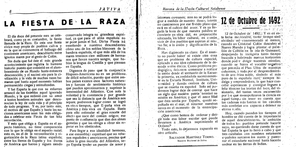 Aquest desafortunat concepte es va oficialitzar a 1913, amb l’objectiu d’estretar llaços entre Espanya i Iberoamèrica, triant la data en què Cristòfor Colom/Cristóbal Colón va entropessar amb Amèrica, on s’havia de destacar la intimitat espiritual existent entre la Nació descobridora i civilitzadora, i les noves formades en sòl americà. Tota la premsa de Xàtiva adoptà tot seguit el terme, seguint les directrius de la cosa políticament correcta, pròpia de cada època. Els exemples són abundants, malgrat que ja hi havia veus que criticaven el terme “raza”, i pensaven que el dia de la Hispanitat, era una denominació molt més pertinent, encara que no em trobat cap veu crítica des d’una perspectiva xativina, la qual cosa era a més impossible en el context de la dictadura de Primo de Rivera. Analitzem alguns d’ells, publicats fa cent anys