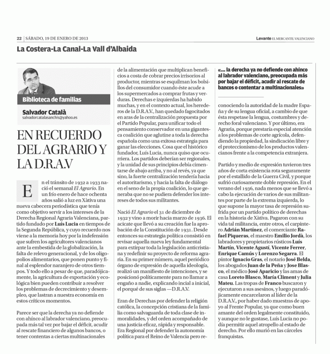 En recuerdo del agrario y la D.R.A.V. HISTORIA DE ESPAÑA A TRAVÉS DE XÀTIVAPor Salvador Catala Sanchis19 enero, 2013
