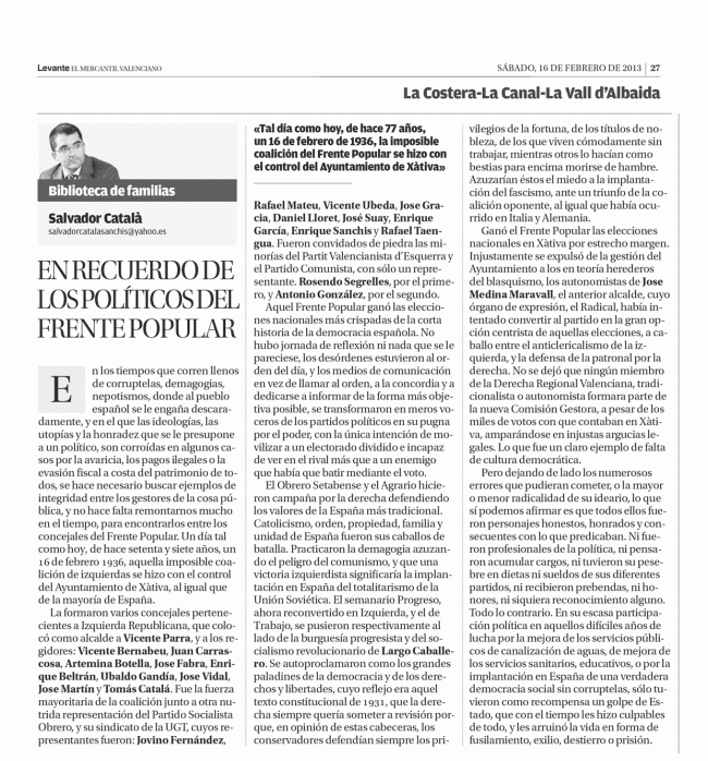 En recuerdo de los políticos del Frente Popular HISTORIA DE ESPAÑA A TRAVÉS DE XÀTIVAPor Salvador Catala Sanchis16 febrero, 2013