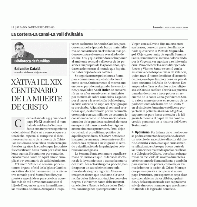Xàtiva i el XIX Centenario de la muerte de Cristo HISTORIA DE ESPAÑA A TRAVÉS DE XÀTIVAPor Salvador Catala Sanchis30 marzo, 2013