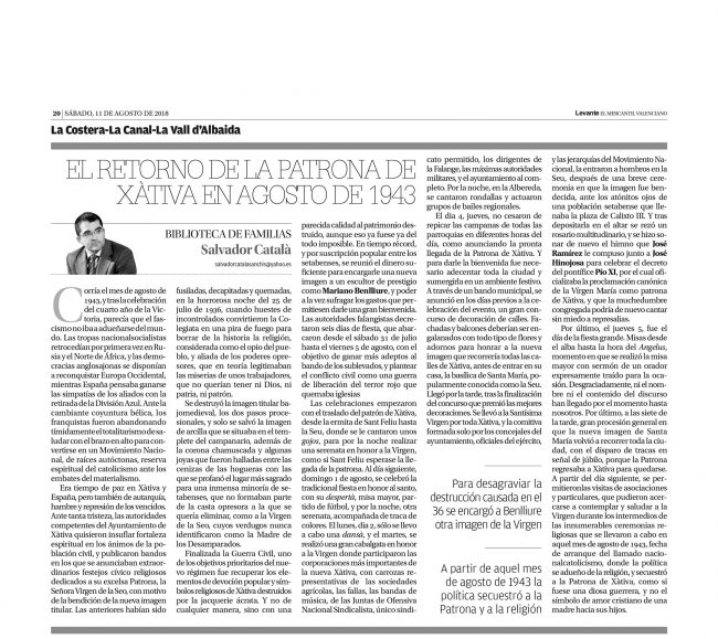 El retorno de la patrona de Xàtiva en agosto de 1943 HISTORIAS DE EMPRESA, SERVICIOS Y SOCIEDADESPor Salvador Catala Sanchis11 agosto, 2018