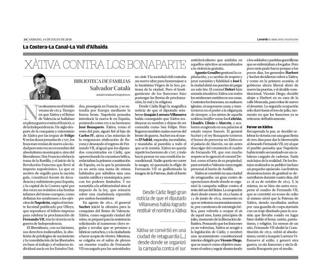Xàtiva contra los Bonaparte HISTORIA DE ESPAÑA A TRAVÉS DE XÀTIVAPor Salvador Catala Sanchis14 julio, 2018