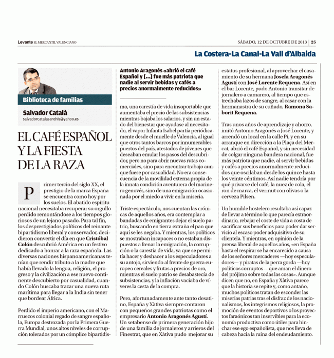 El café español y la fiesta de la raza HISTORIAS DE EMPRESA, SERVICIOS Y SOCIEDADESPor Salvador Catala Sanchis12 octubre, 2013