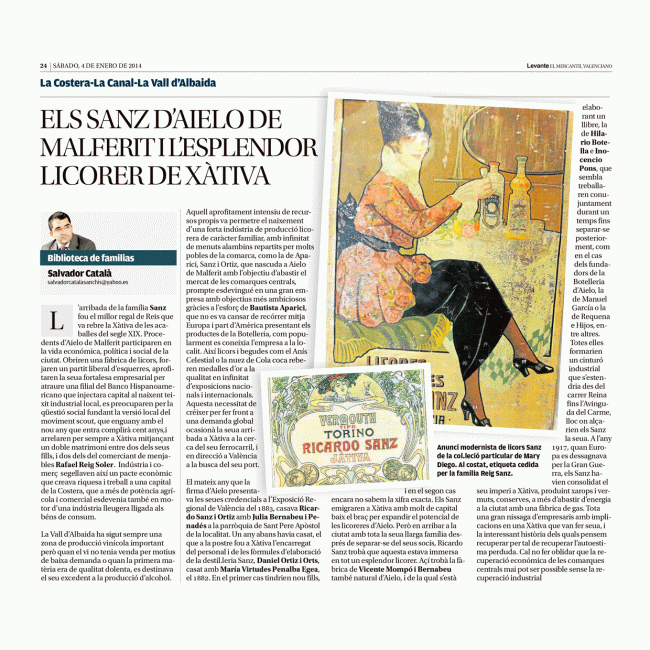 Els Sanz D’Aielo de Malferit i l’esplendor licorer de Xàtiva HISTORIAS DE EMPRESA, SERVICIOS Y SOCIEDADESPor Salvador Catala Sanchis4 enero, 2014