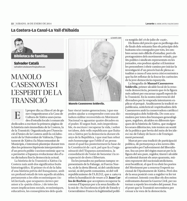 Manolo Casesnoves i l’espirit de la transició HISTORIA DE ESPAÑA A TRAVÉS DE XÀTIVAPor Salvador Catala Sanchis18 enero, 2014