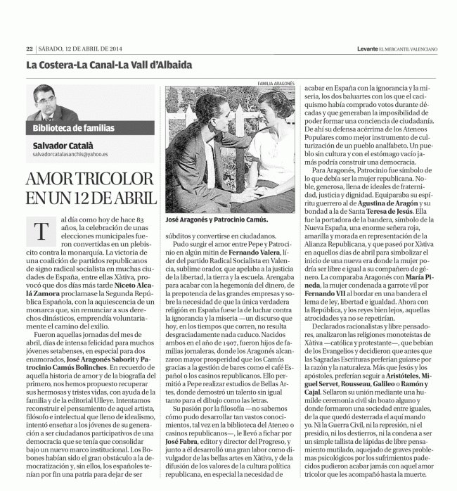 Amor tricolor en un 12 de abril HISTORIA DE ESPAÑA A TRAVÉS DE XÀTIVAPor Salvador Catala Sanchis12 abril, 2014