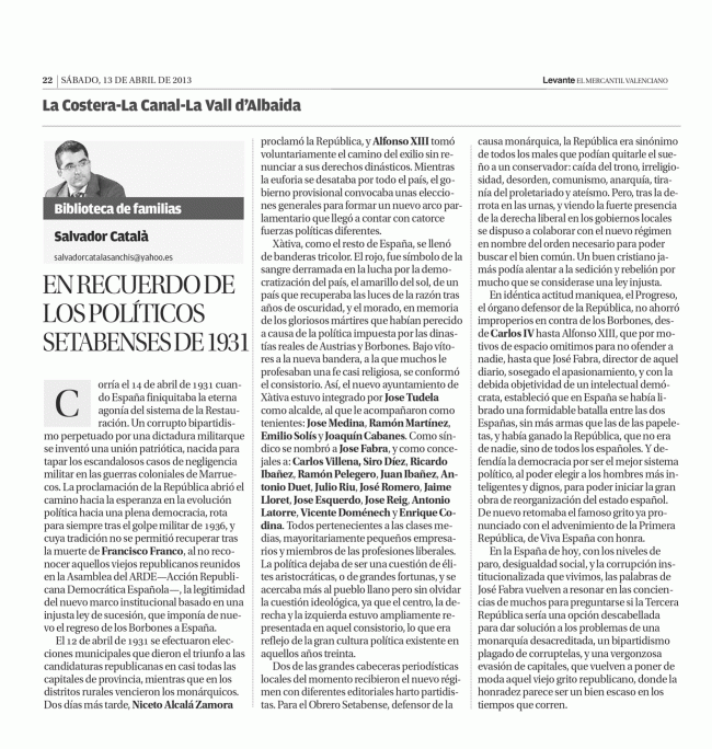 En recuerdo de los políticos setabenses de 1931 HISTORIA DE ESPAÑA A TRAVÉS DE XÀTIVAPor Salvador Catala Sanchis13 abril, 2013