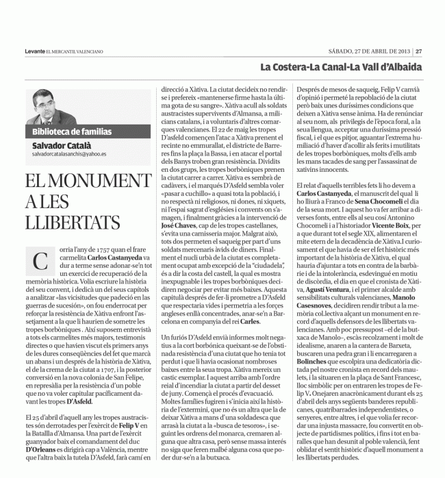 El monument a les llibertats HISTORIA DE ESPAÑA A TRAVÉS DE XÀTIVAPor Salvador Catala Sanchis27 abril, 2013