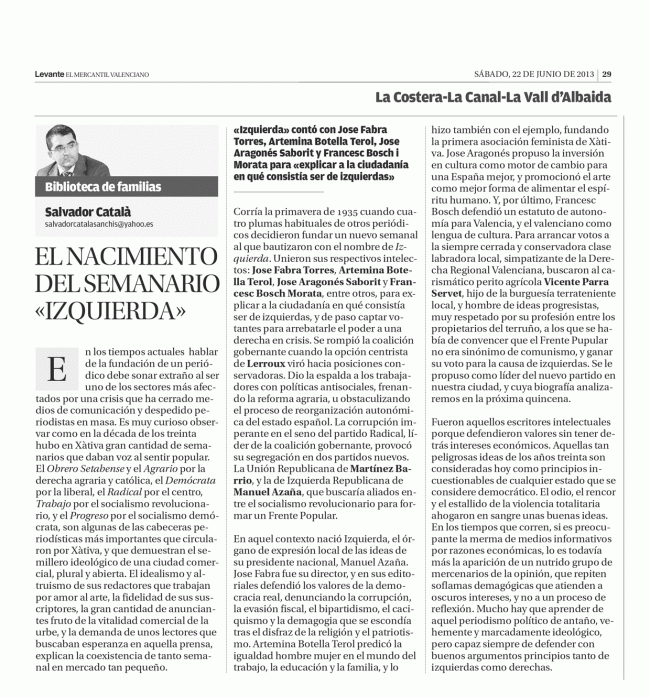 El nacimiento del semanario «Izquierda» HISTORIA DE ESPAÑA A TRAVÉS DE XÀTIVAPor Salvador Catala Sanchis22 junio, 2013