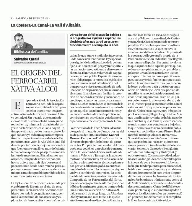 El origen del ferrocarril Xàtiva-Alcoi HISTORIA DE ESPAÑA A TRAVÉS DE XÀTIVAPor Salvador Catala Sanchis6 julio, 2013
