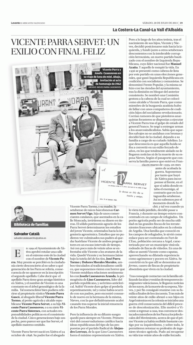Vicente Parra Servet: un exilio con final feliz HISTORIA DE ESPAÑA A TRAVÉS DE XÀTIVAPor Salvador Catala Sanchis20 julio, 2013