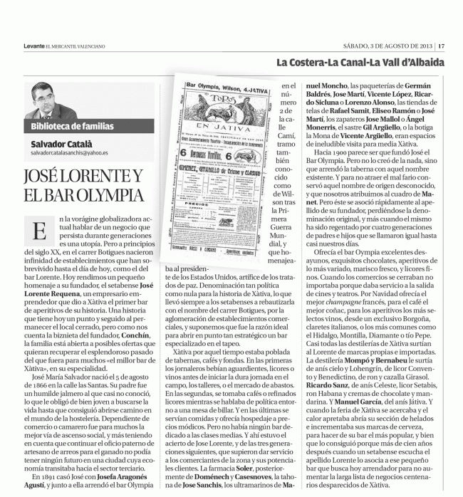 José Lorente y el bar Olympia HISTORIAS DE EMPRESA, SERVICIOS Y SOCIEDADESPor Salvador Catala Sanchis3 agosto, 2013